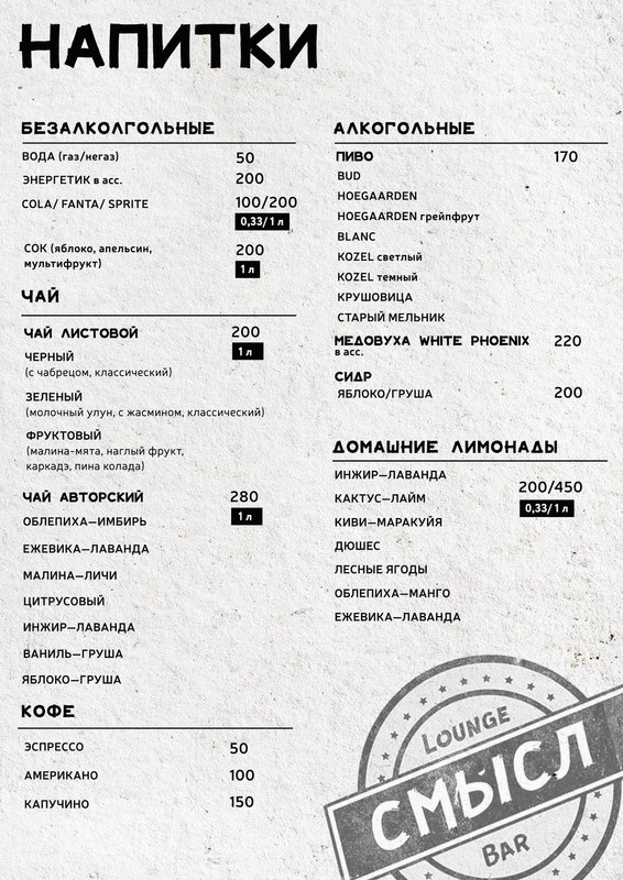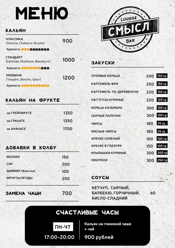 Хочется просто расслабиться, отдохнуть мыслями (одному или в компании друзей), а, может, нужно пообщаться с коллегами, но не в рамках офиса? Независимо от причины загляните к нам, в лаундж-бар Смысл! Клубящийся дым и любимые ароматы - это прекрасное место, чтобы насладиться ароматами кальяна. К вашим услугам разные виды табака в кальянной карте и эксперименты от наших кальянщиков.